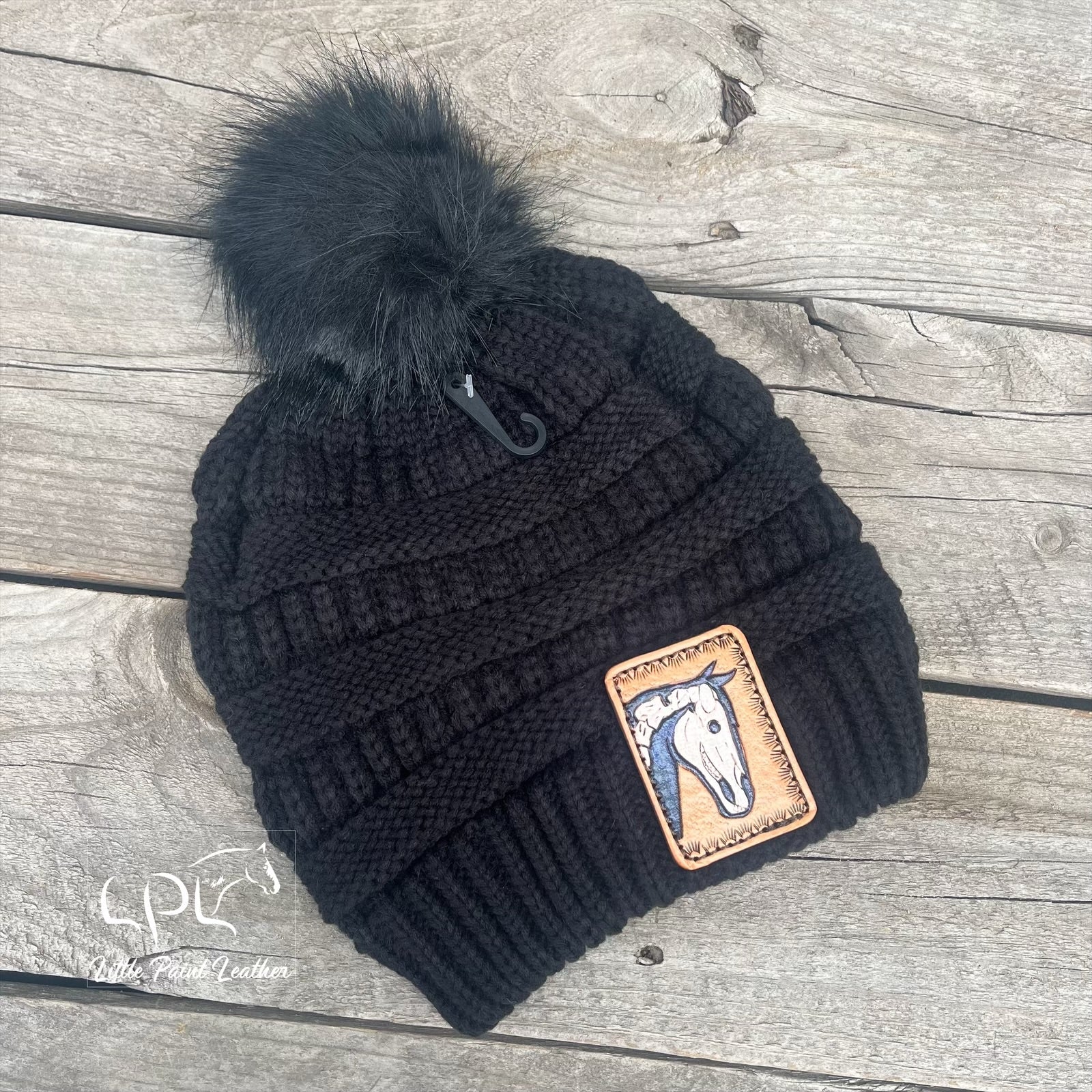 This adorable adult sized acrylic knitted beanie is sure to keep you warm and stylish! This one has a faux fur pom. Featuring one of our super cute hand tooled and painted leather patches.