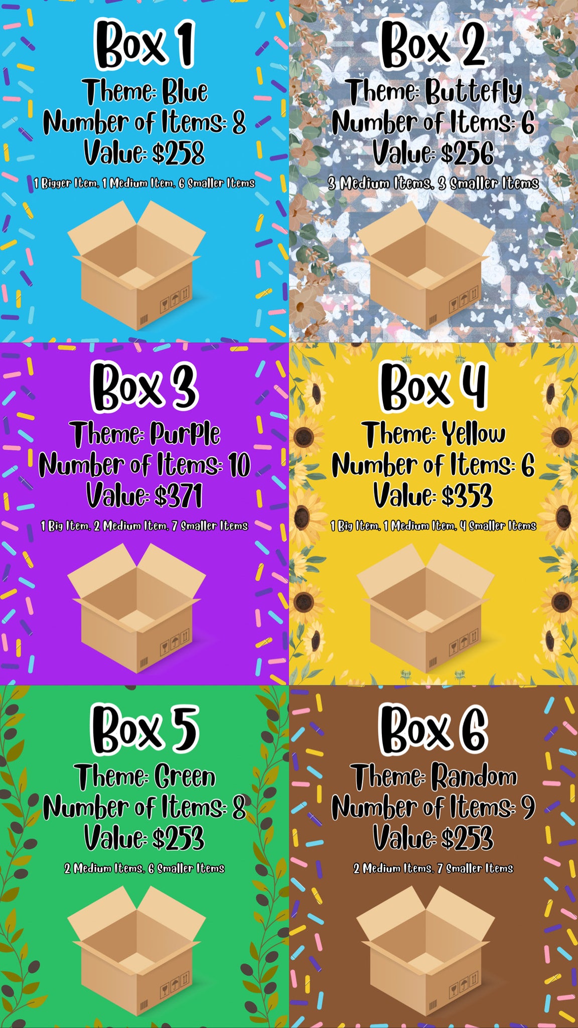 Each one has a theme to it but please keep in mind there might be items thrown in that are slightly off theme.