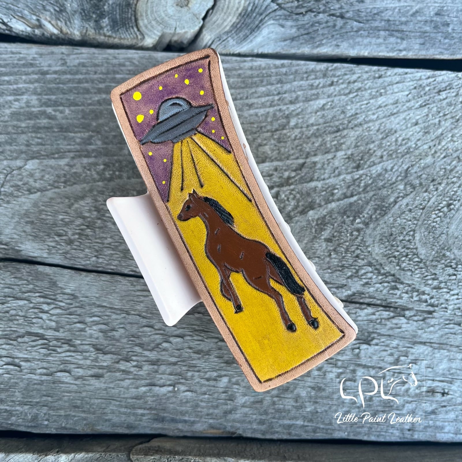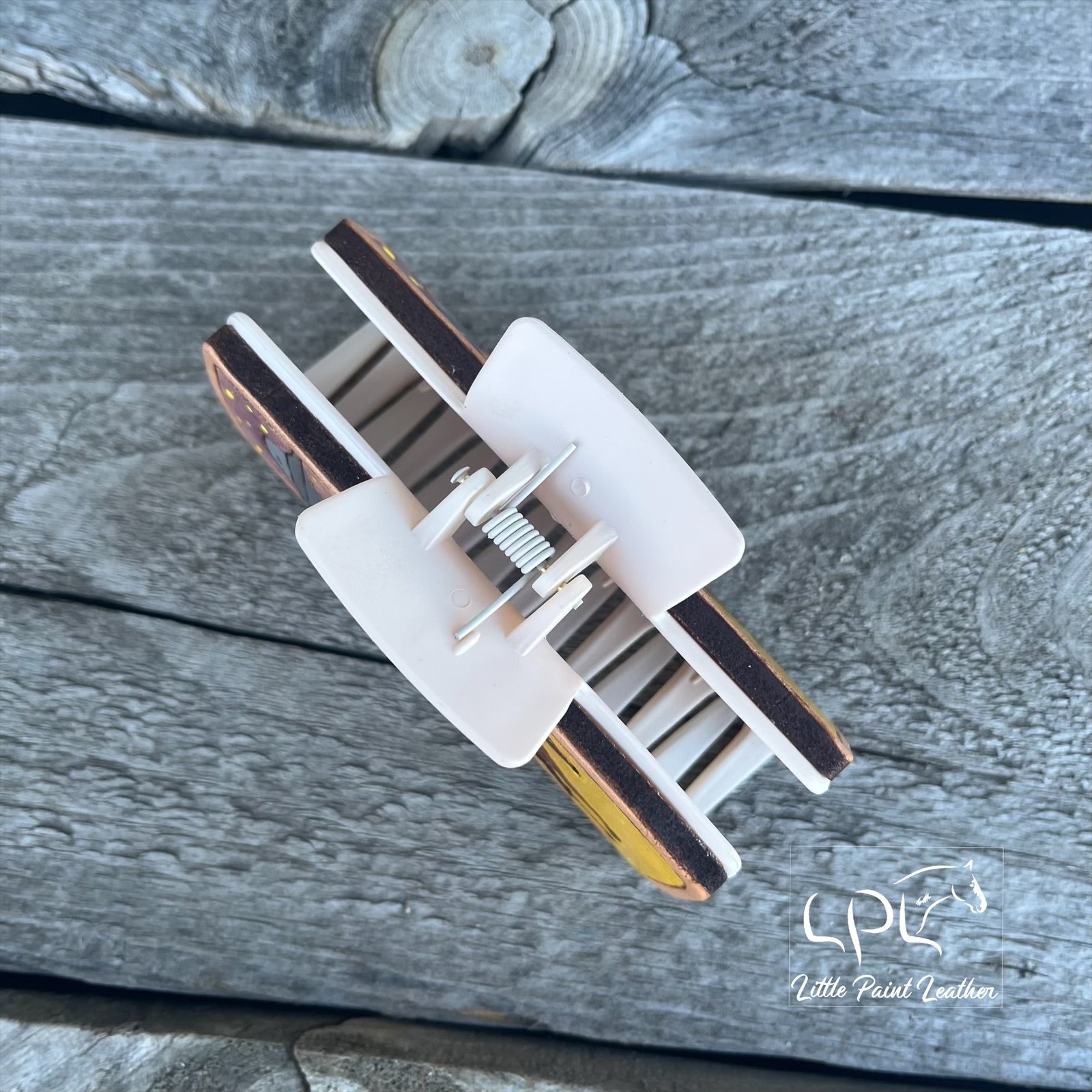 4.1" long clip. Super fun way to dress up your hair with these clips! Featuring hand tooled and painted leather strips on both sides.