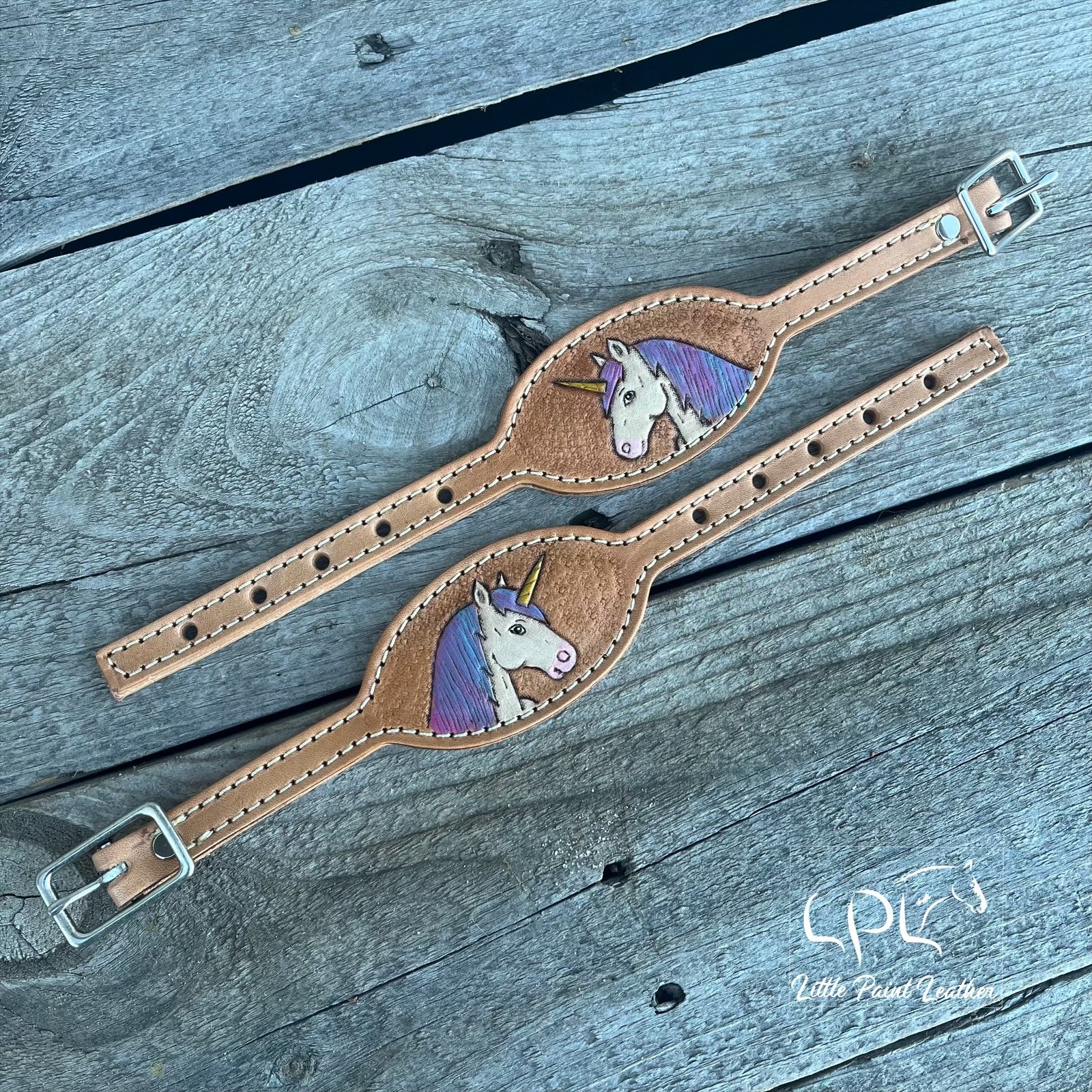 These stirrup hobbles are a great way to dress up your saddle! These attach to the leathers above your stirrup on your western saddle. This one features a hand tooled and painted design.